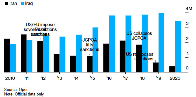 Iraq’s oil exports have surged ahead of santioned Iran’s, millions of bpd