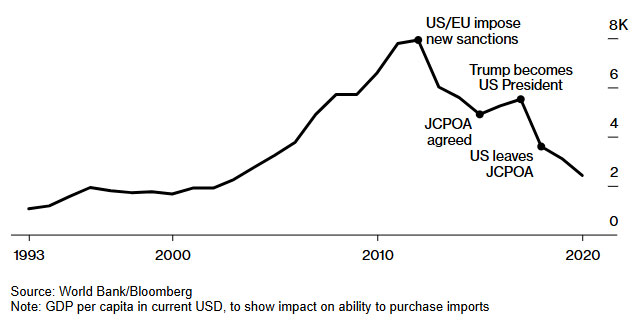 Iran’s GDP per capita fell after sanctions increased, in thousands of $